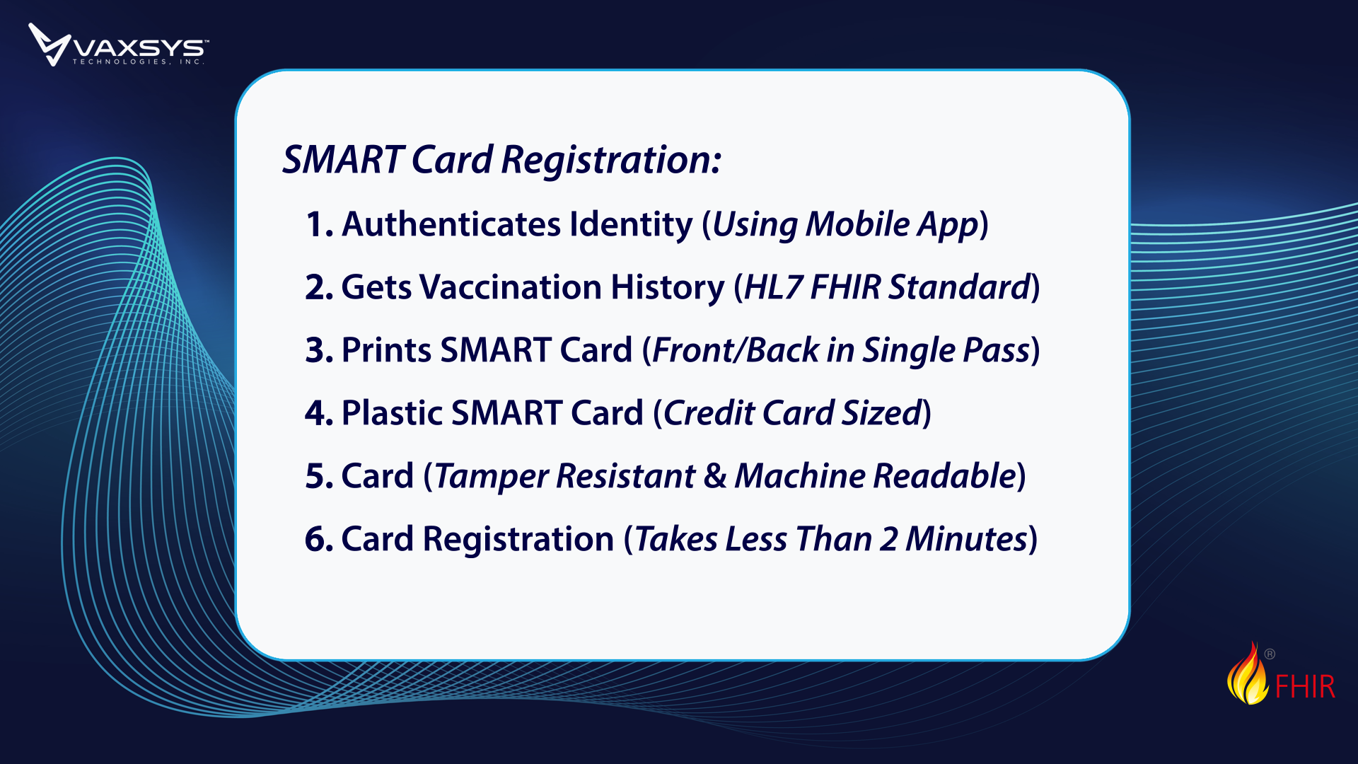 The VAXSYS® Durable SMART™ Health Card System employs key technologies to ensure that the card issuing process is quick, easy to use, accurate and secure. Paramount to the system is vendor 'ease of use.' On site, participants may be enrolled, key medical records integrated via SMART Links, and a personalized durable SMART Health Card printed–all in about 5 minutes. The participant's card may then be read at any location using any SMART Health Card reading App on the App Store or Google Play Store.