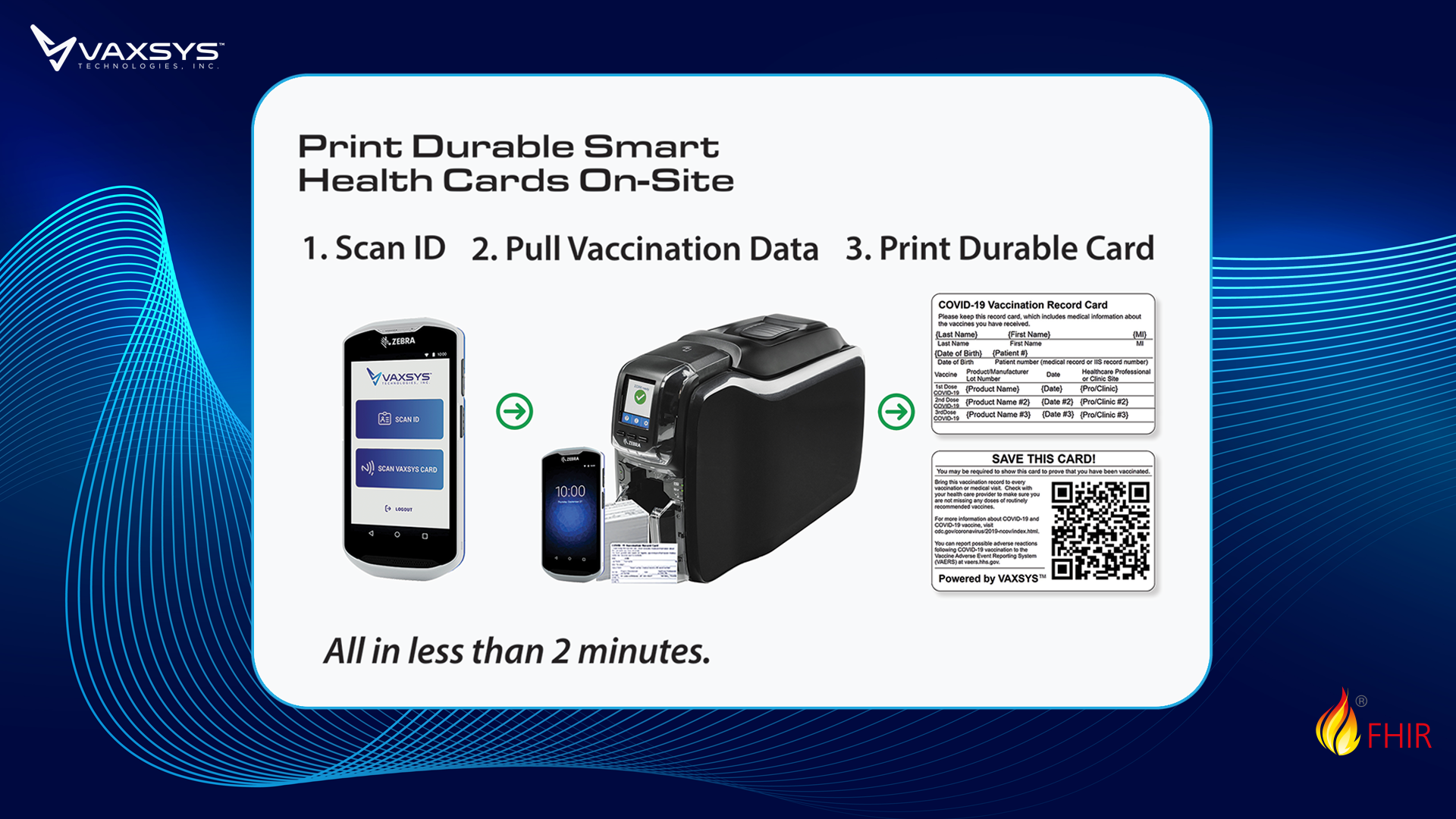 For Issuing Organizations, the VAXSYS SMART Health Card provides instantaneous access to the verifiable vaccination record of each patient. Card issuance includes the (1) confirmation of the patient’s identity, (2) gathering of existing vaccination history via an EHR, via HL7 FHIR standards, and (3) printing of the patient’s card on-site: a process takes less than 2 minutes. Further, the Durable SMART Health Card appearance is customizable, supporting language selection and organizational branding.